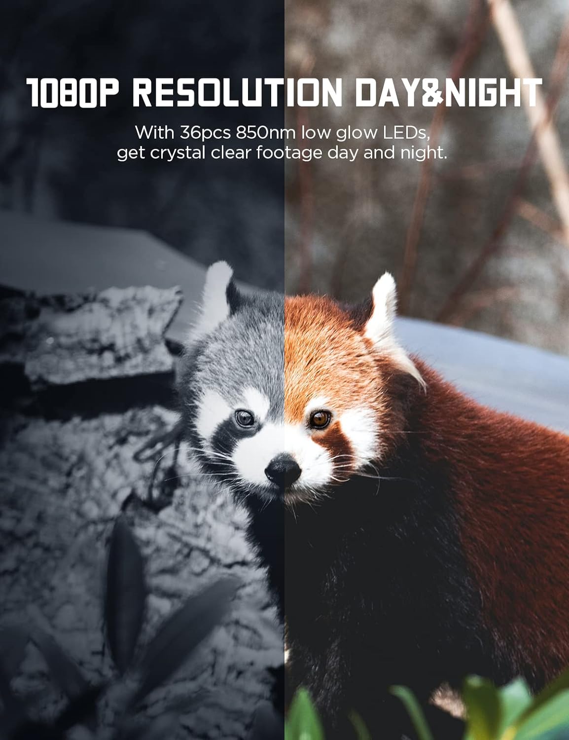 Fully automatic IR filter, built-in 36 PCS 850NM Infrared LEDs, this game hunting camera can capture crisp black and white nighttime images for a wide range. The low glow IR LEDs help to capture the animals in the night without disturbing them.