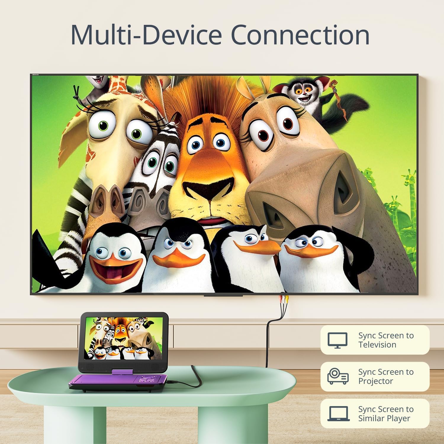 - [Sync Screen Playback]Using a single AV cable, you can share the same film between two DVD players. Can also connect a TV, projector, and other devices to build your own home theatre at home.
