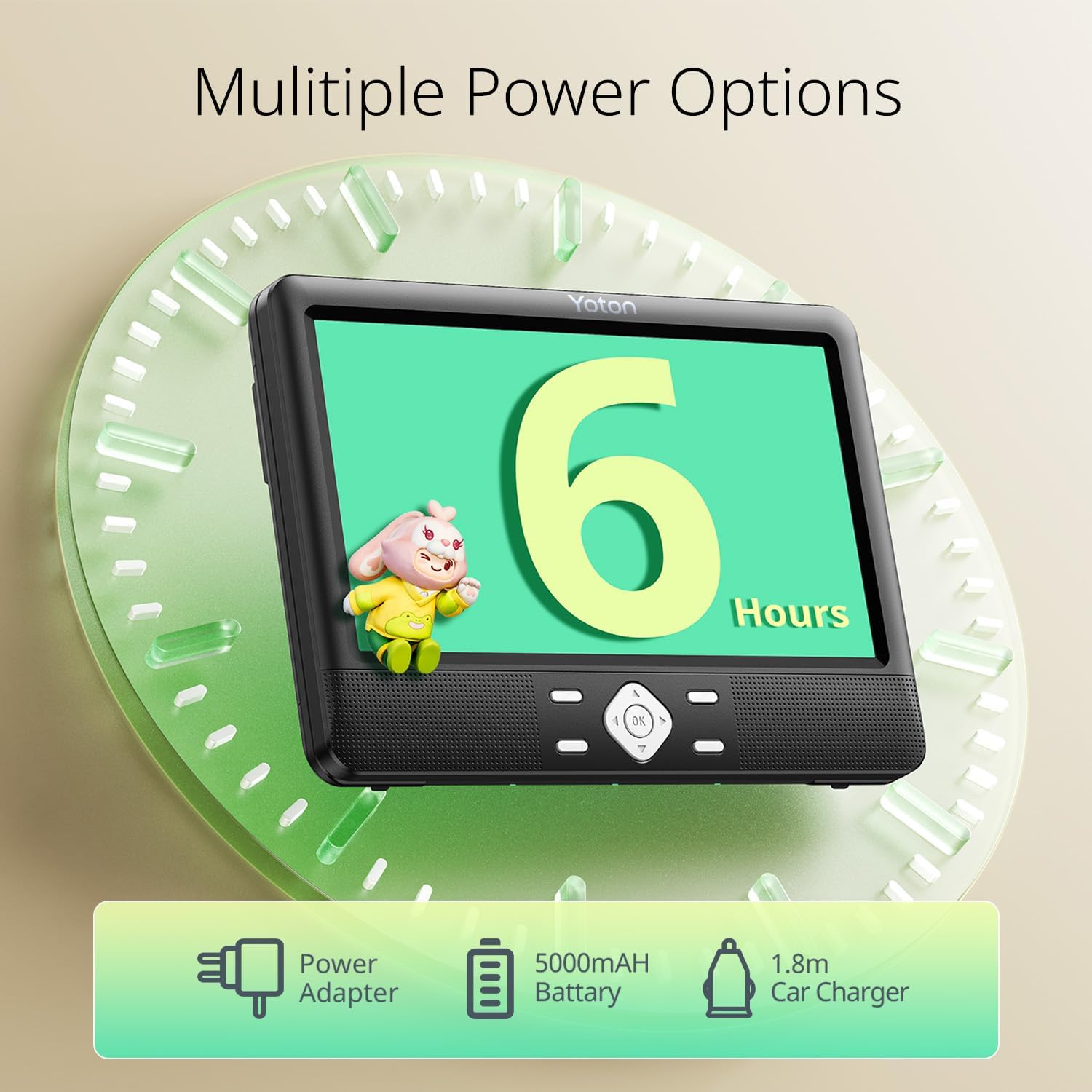 - 【4-6 Hours Built-in Battery Life】 The portable DVD player has a built-in 5000mAh rechargeable battery. Charging for 3 hours can ensure about 5 hours of playback. It is also equipped with a two-in-one car charger, allowing you to charge it in the car at the same time.