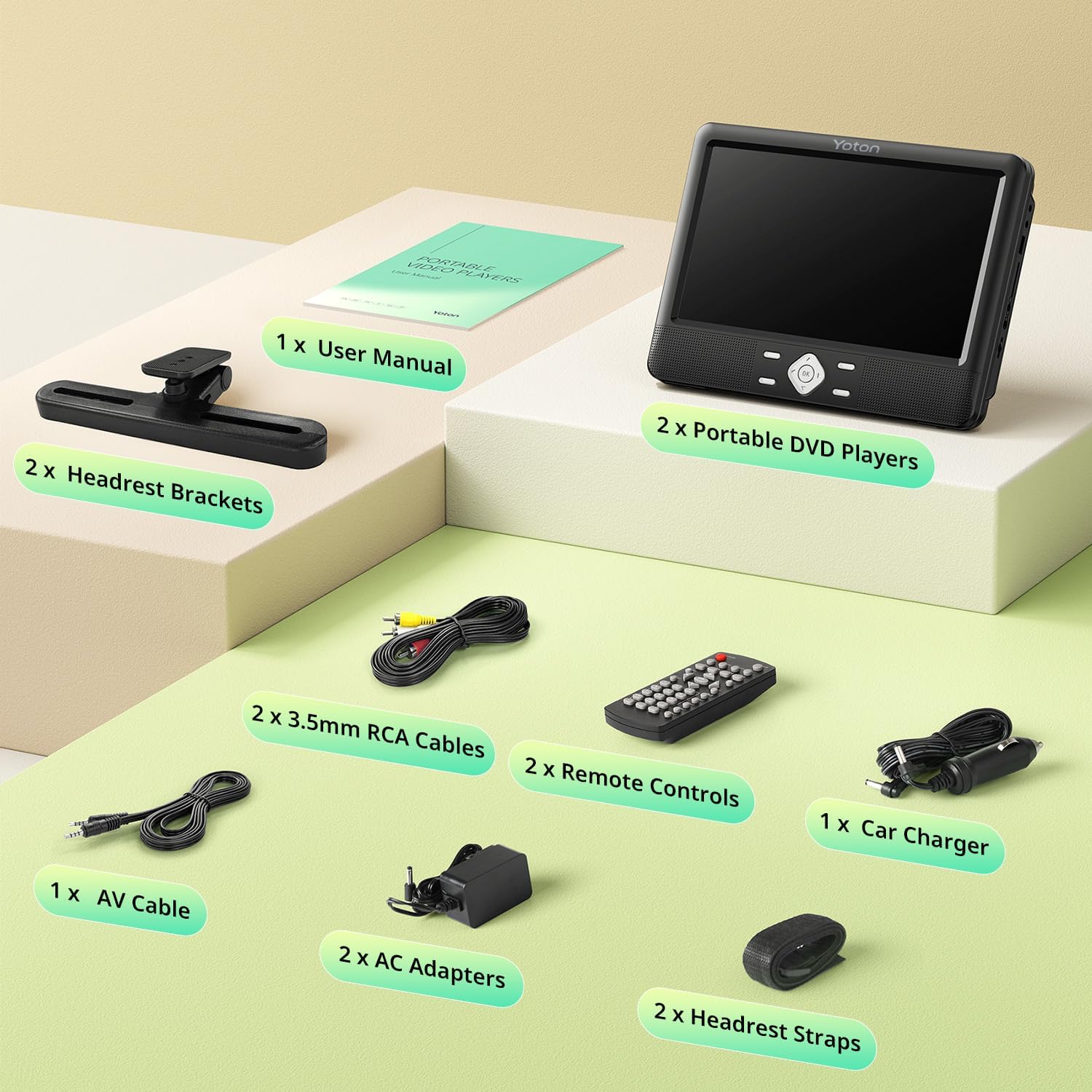 Cocobear 10.5" Portable DVD Player w/ Dual Screen, Remote, USB, 1080p, Mount Brackets – 2-Pack